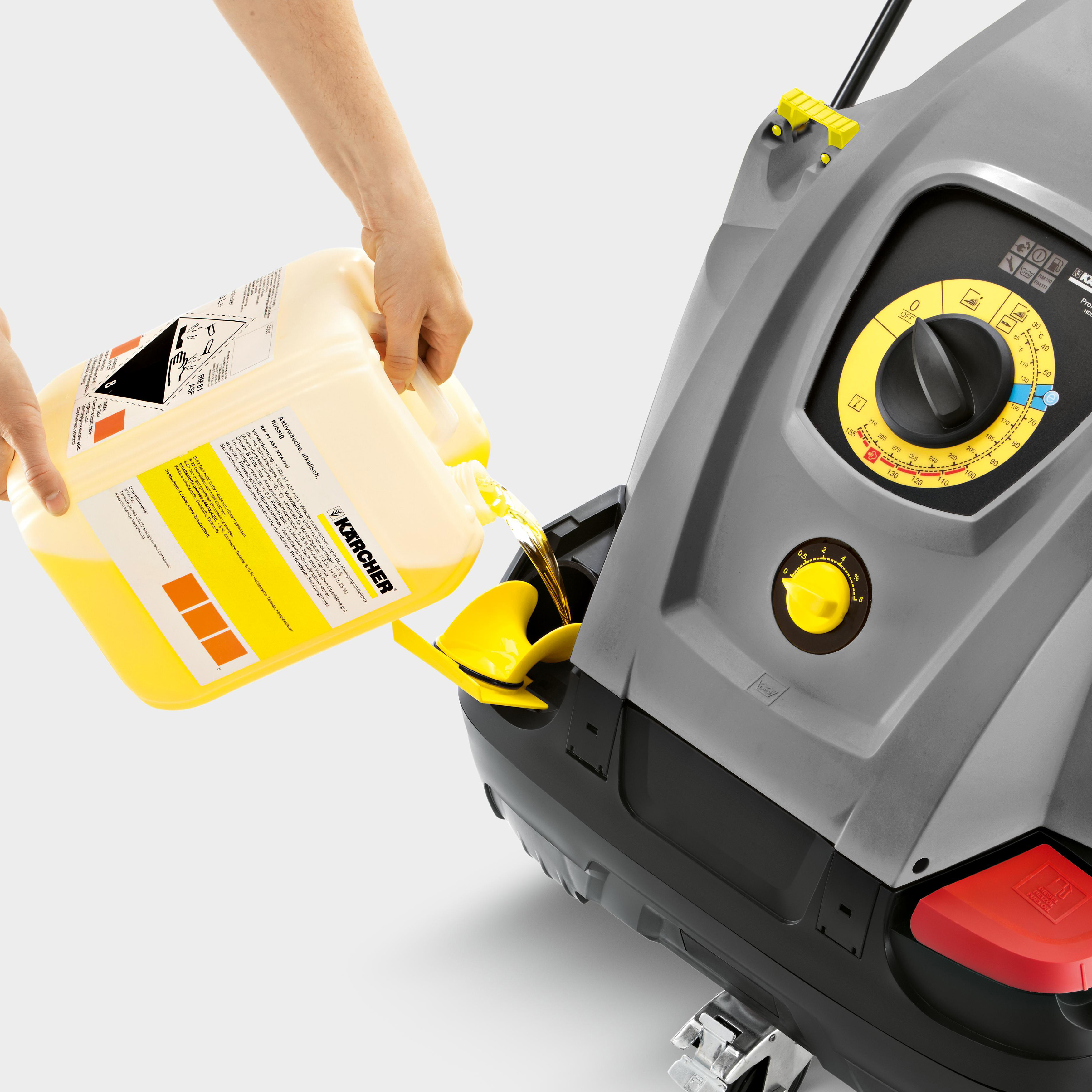 Интуитивно-понятное управление с большим селекторным кнопочным переключателем. Бак с большим отверстием и заправочным желобом. Бутылка со средством для ухода удобно меняется снаружи.